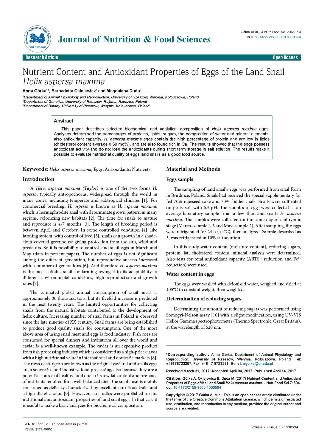 Nutrient Content and Antioxidant Properties of Eggs of the Land Snail